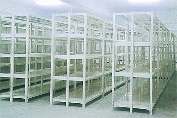本儲放架為抽屜式、以上方天車吊架作為存取工具、可減少走道面積