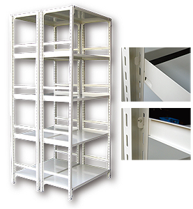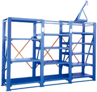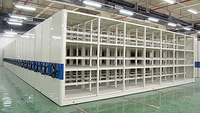 本儲放架為抽屜式、以上方天車吊架作為存取工具、可減少走道面積